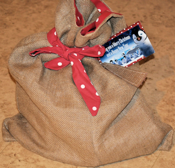 They opened the box, and what was in side was delightful. A gorgeous hessian sack, tied with ribbon and with a jingly bell attached. Lifting the sack up gave the jingle jangle that signalled christmas had made it early to the Scottish Mum household with the first seasonally wrapped pressie to hit our home.