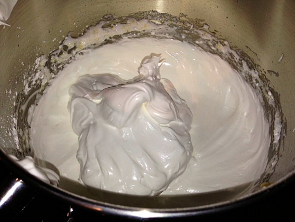 4. Add the vinegar, cornflour and vanilla essence and continue to mix for up to 8 minutes, until the mix is smooth and glossy.