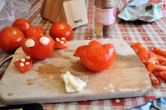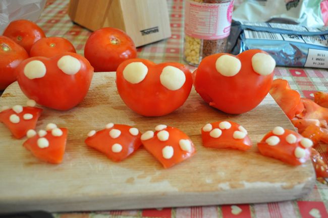 The marzipan sticks to the dried tomatoes very easily, so was perfect for the spots and base for the eyes. I could have also used it for the top of the antennae, but I had fruit flakes so used them to have something different.
