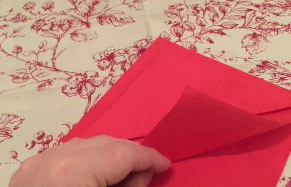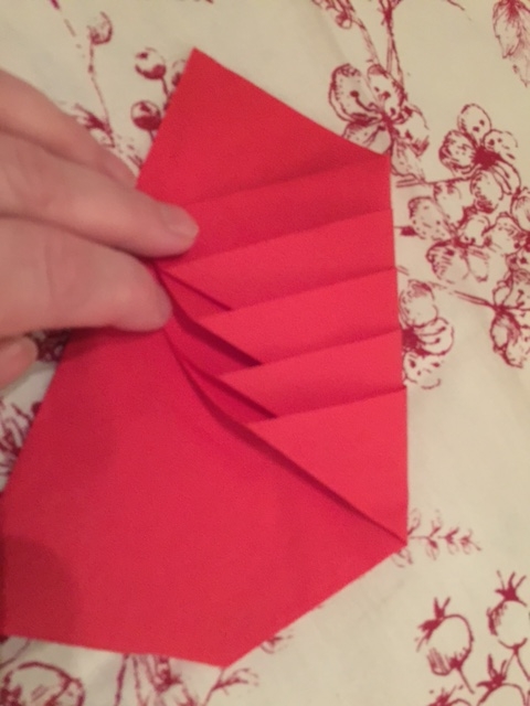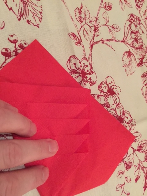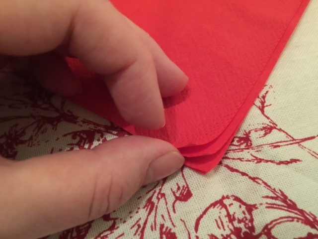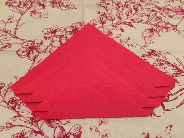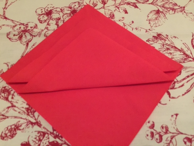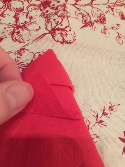 Turn the napkin towards you, so it looks like a diamond shape, with the loose ends under your fingertips, like the image above.