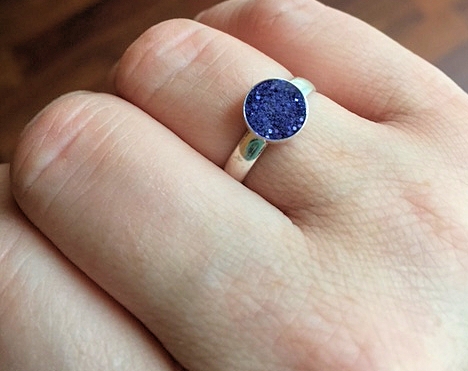 Using a mix of resin, glitter and colour, I’ve come up with an alternative, using sterling silver as a base, and the colour added to the settings, whether they’re rings or pendants.