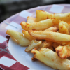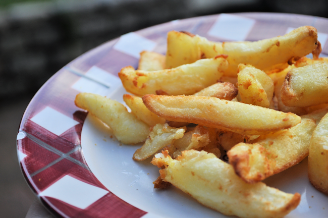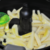 I tried and failed miserably to peel, chop, dry and cook potatoes from fresh. Not that it’s an issue, as frozen chips are cheaper to buy and cooked much more consistently for me. A definite winner that way. I’ve learned that for our crispy chips, I need to do two rounds of chips, but I find ours are ready around the fifteen to eighteen minute mark for around 1kg. I put those in the oven until the second lot are done.