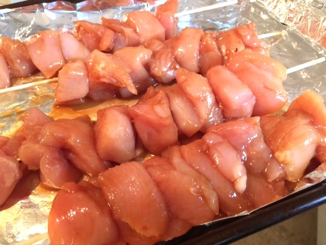 - Slip your chicken onto the kebab sticks, and lay on foil prepared flat baking trays.