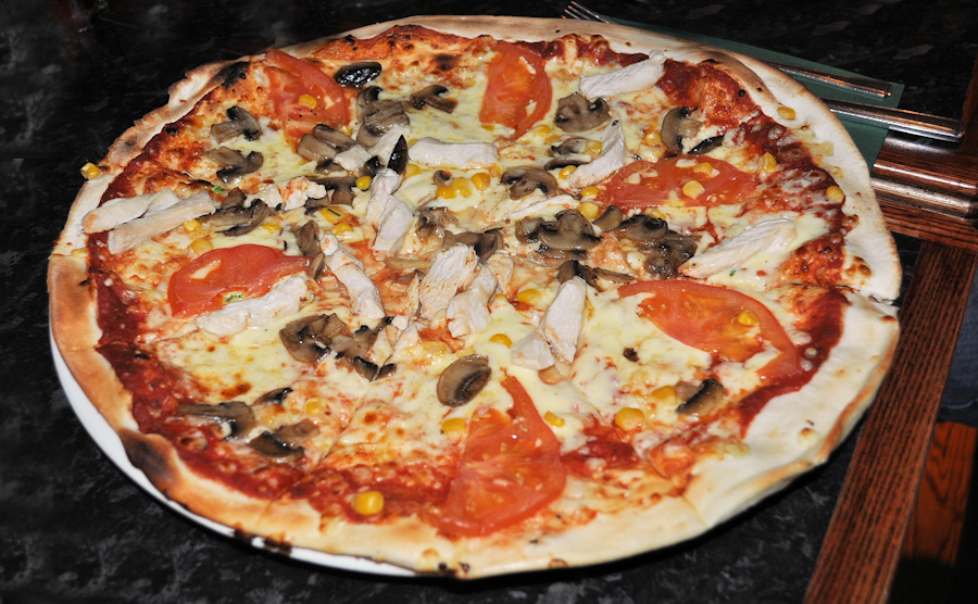 The kids had their favourites and the man had a burger. I wanted a pizza and the rest of them wanted a bit too, so I ordered a 15″ for us all to share. The chicken and sweetcorn on top was a little sparse on the pizza, but other than that, it was lovely. The junior burger was as big as his dad’s. He was very happy with that.
