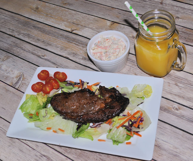 - Mix all the ingredients, apart from the salad to serve and the steaks into a bowl big enough to hold everything when it's being cooked. I prefer to use a glass or steel dish rather than plastic. Mix the ingredients until smooth.