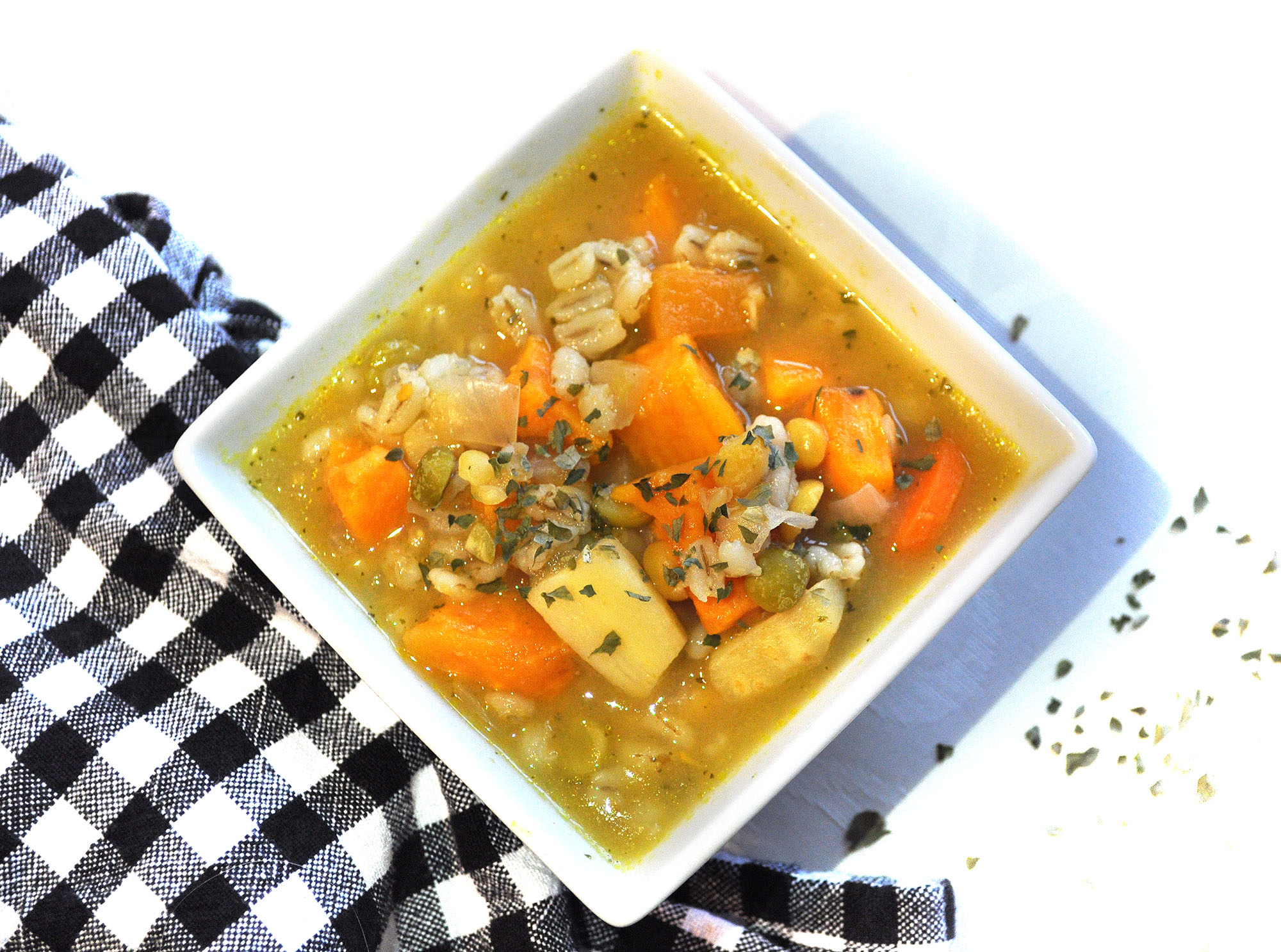 Pop on the lid and cook for 4 hours on high or 8 hours on low, for a high wattage slow cooker. Adjust the cooking time based on your knowledge of your own machine. The vegetables are likely to take the longest to cook, especially the carrots and white sweet potatoes.