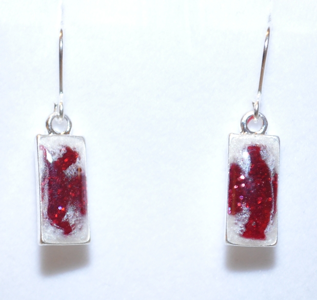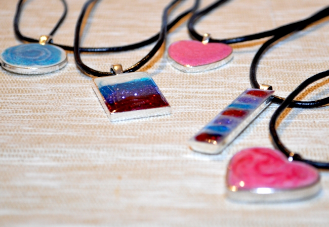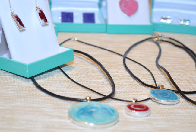 Using a mix of resin, glitter and colour, I’ve come up with an alternative, using sterling silver as a base, and the colour added to the settings, whether they’re rings or pendants.