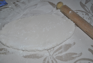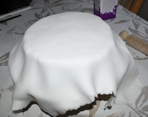 The next step is the easiest.  I cheated and bought pre-made icing which was ready to roll.   Spreading a little icing sugar on my counter, I rolled it out until it was large enough to cover the whole cake.   With a pastry brush, I painted a very thin layer of golden syrup on one side of the icing to help it to stick to the cake.  The syrup does make picking up the icing and putting it over the cake tricky, but if you roll the icing out to bigger than you need, it is doable.