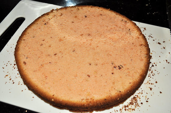 I turn the topped sponge upside down to place on top of the filled bottom section and then cut around the crusts to make sure it looks even.